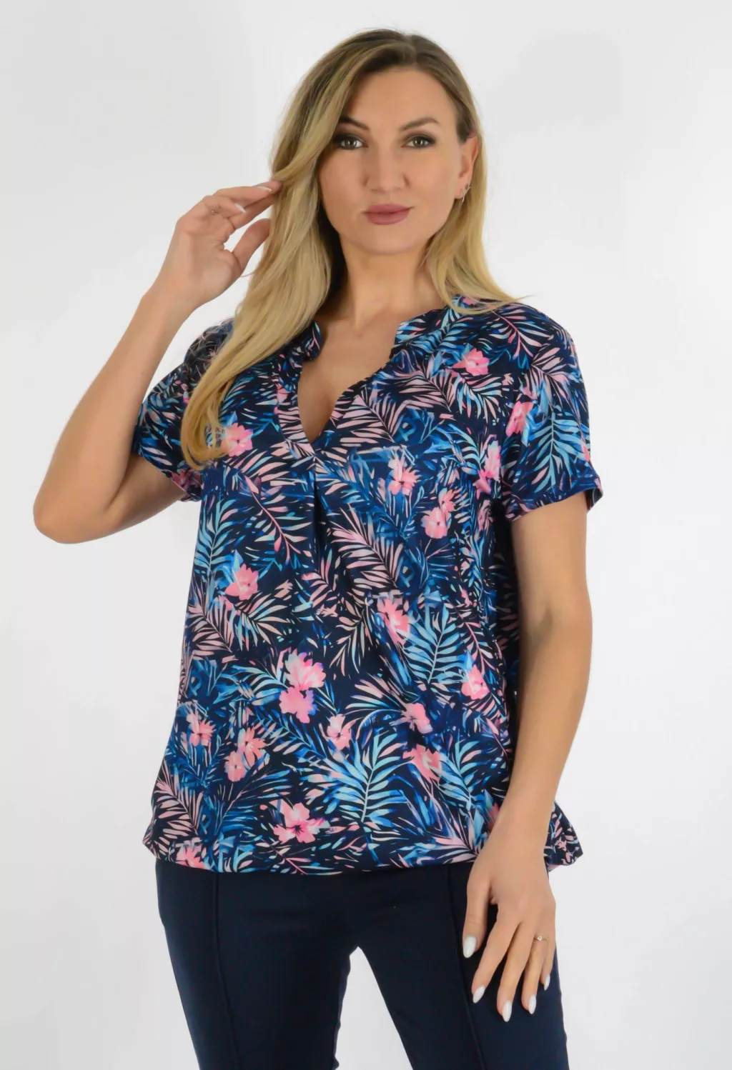 Levél mintás, ingfazonú ,gumis aljú felső! sötétkék-rózsaszín L-XXL