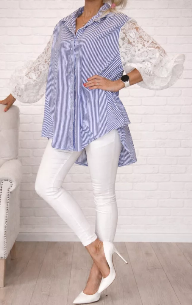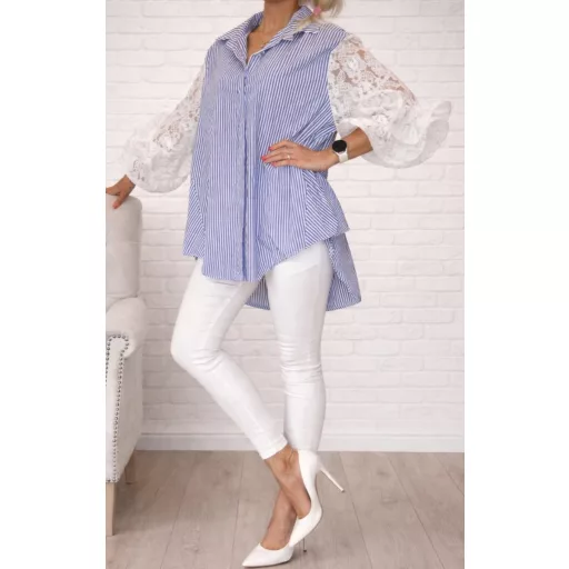 Csíkos,csipkés fodros ujjú,hátulja hosszabb ing ! kék-fehér  L-XXL