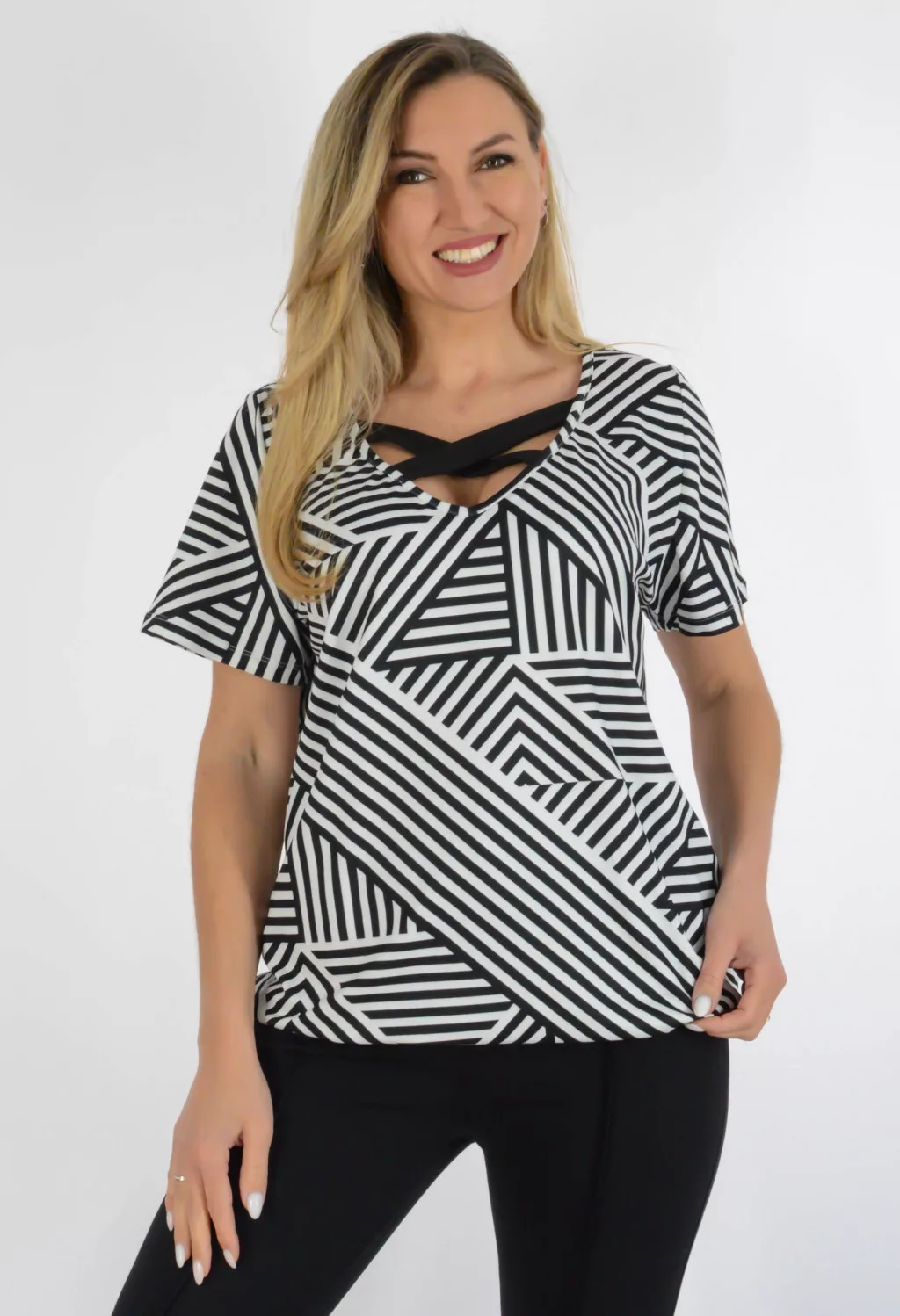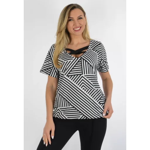 Mintás,mellnél keresztpántos,gumis aljú felső! fekete-fehér L-XXL