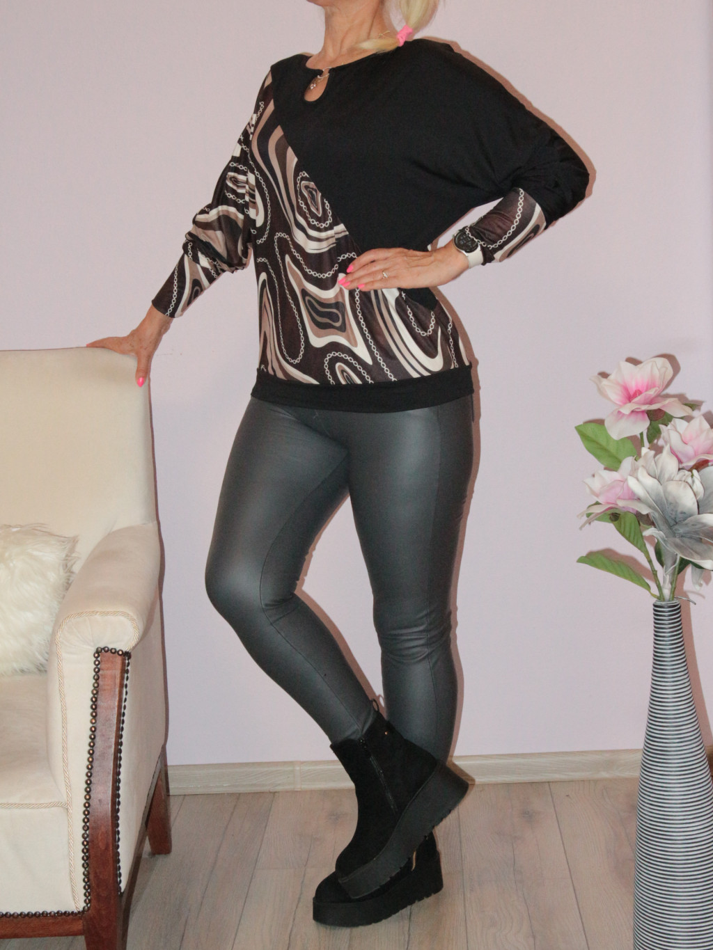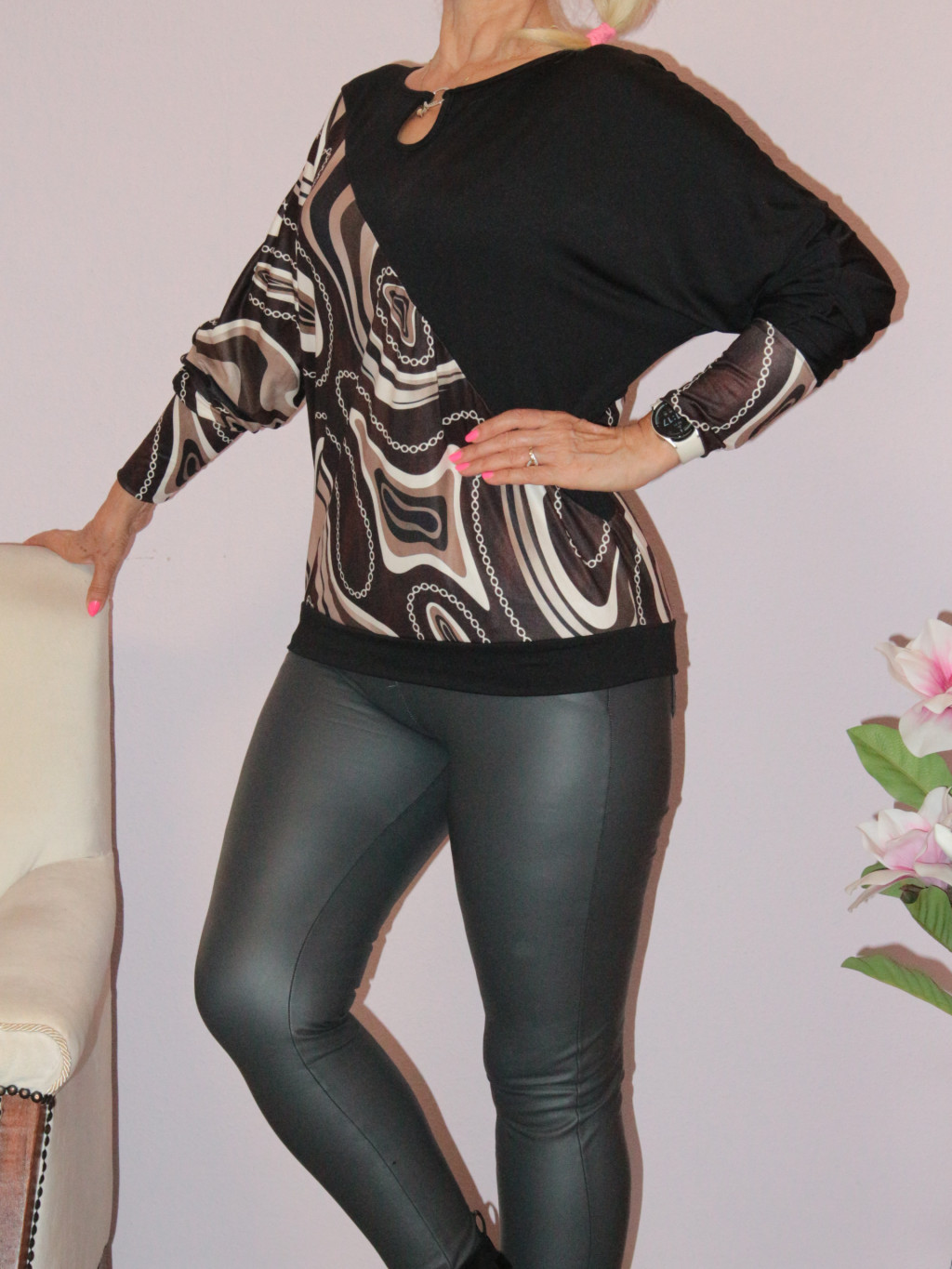 Mintás,cseppkivágású,passzés aljú felső! fekete-barna L-XL
