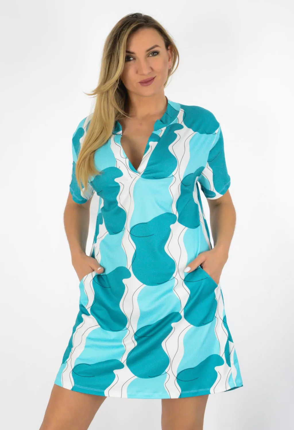 Mintás,ingnyakú,zsebes tunika ! türkiz-fehér L-XL