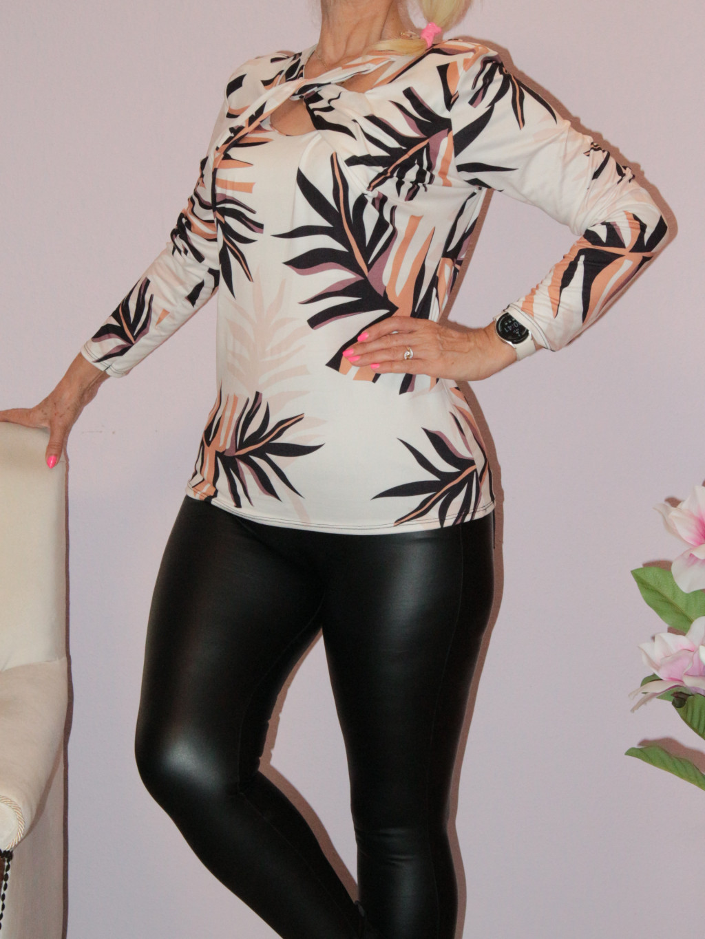 Levél mintás,csavart elejű felső ! ekrü-fekete-terrakotta M-XL