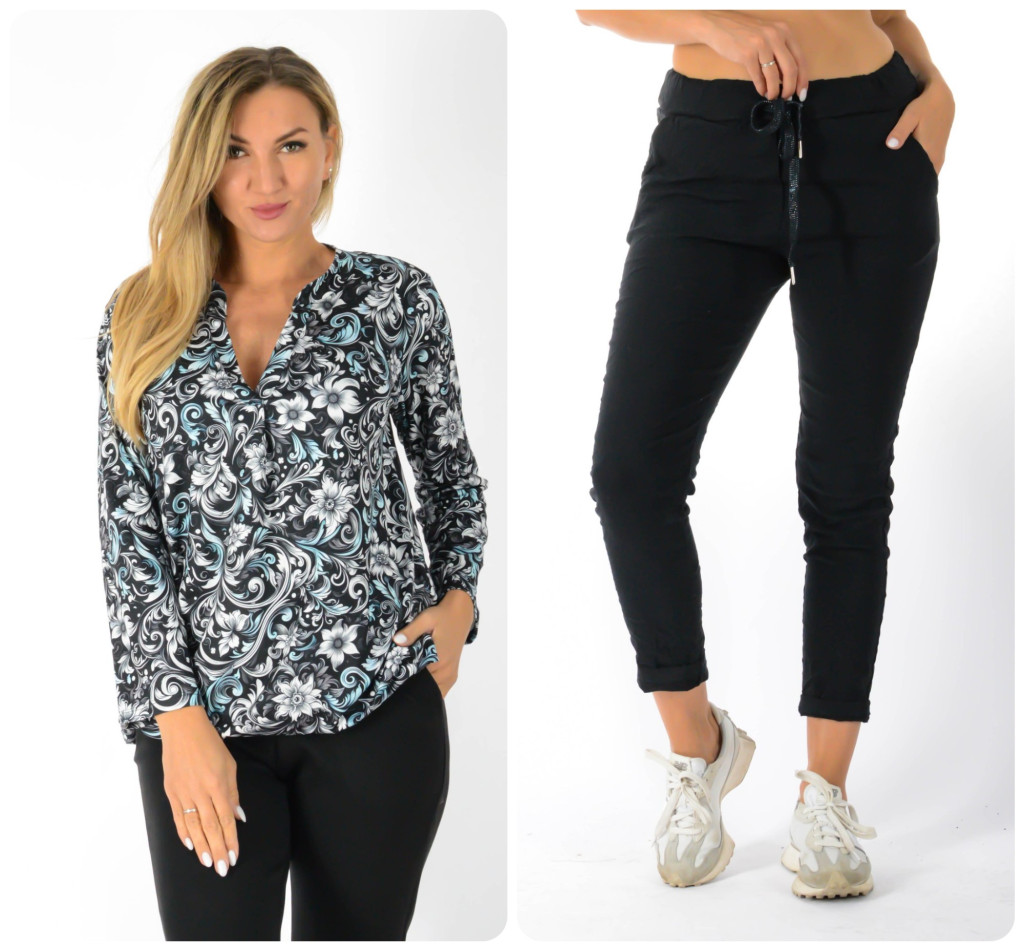 Virág mintás ingfazonú gumis aljú ,nadrágos szett ! fekete-fehér-kékL-XXL Virág mintás ingfazonú gumis aljú ,nadrágos szett ! fekete-fehér-kékL-XXL