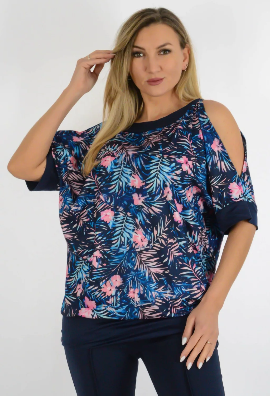 Levél mintás,válla nyitott,denevérujjas felső! sötétkék-rózsaszín L-XXL
