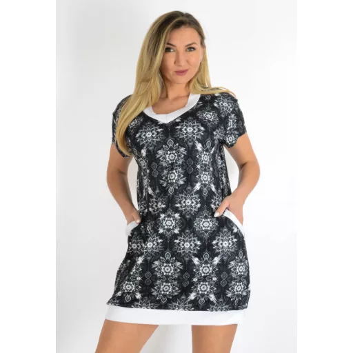 Mandala mintás, V nyakú,zsebes tunika/ruha! fekete-fehér L-XL