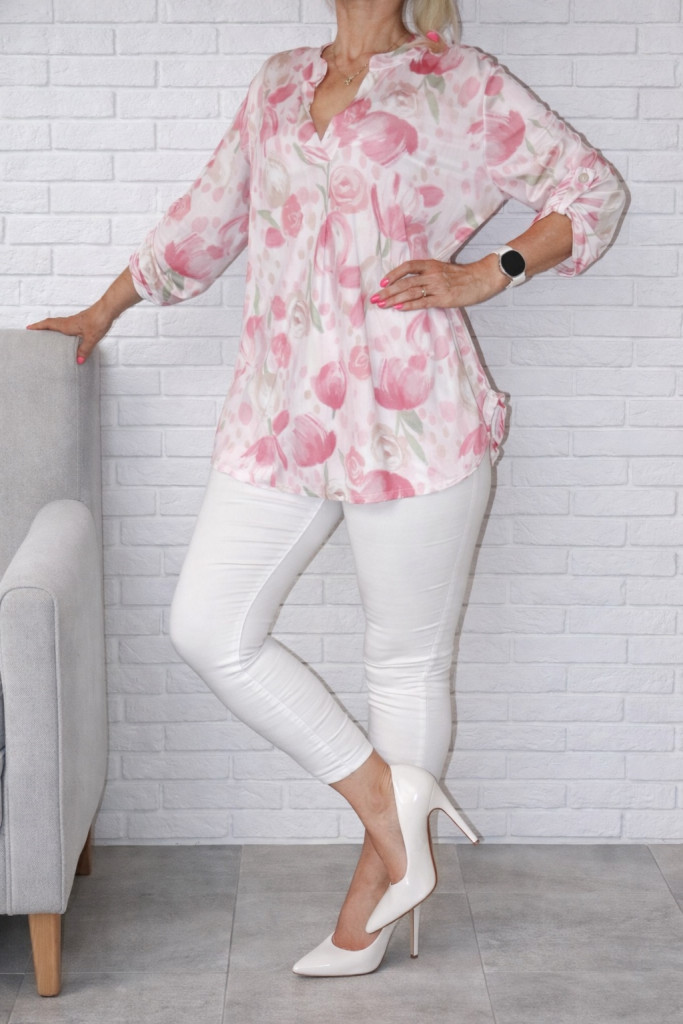 Virágos,roll-up ujjú ingfazonú felső ! púderrózsaszín-mályva XL-XXL