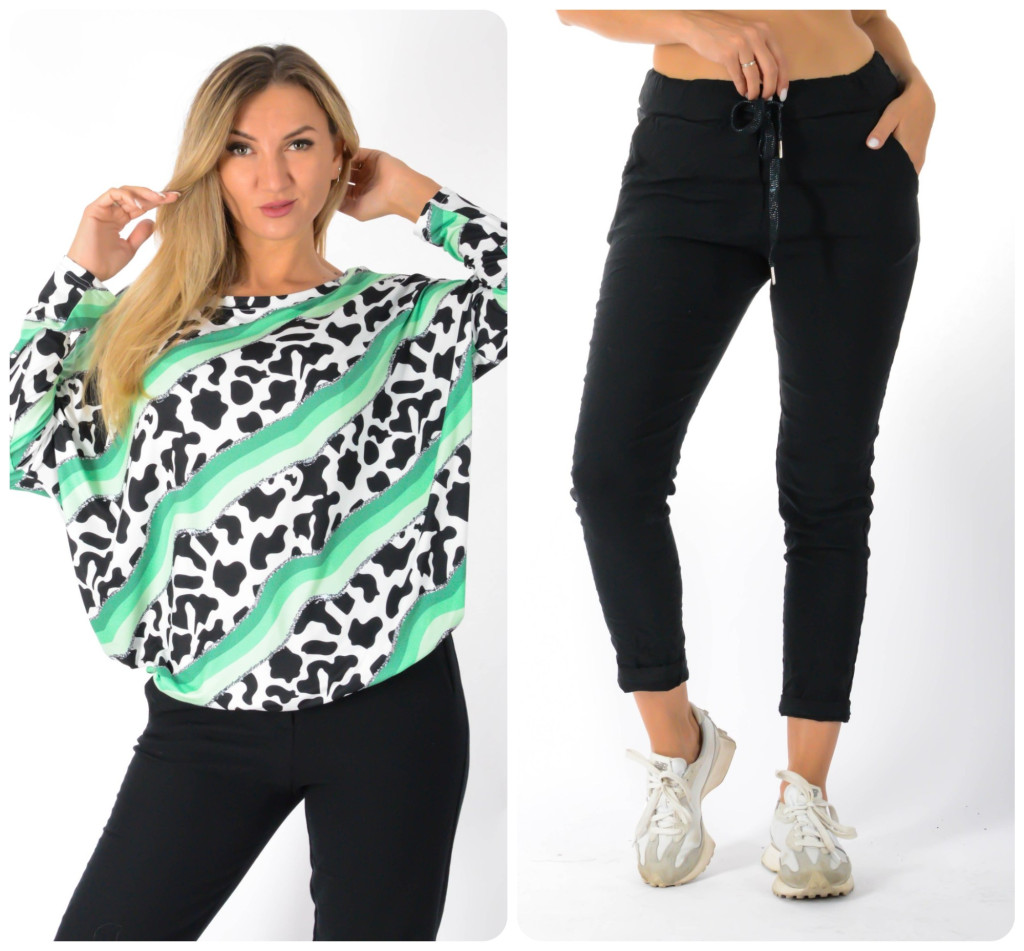 Leopárd mintás aszimmetrikus gumis aljú ,nadrágos szett ! zöld-fekete L-XXL