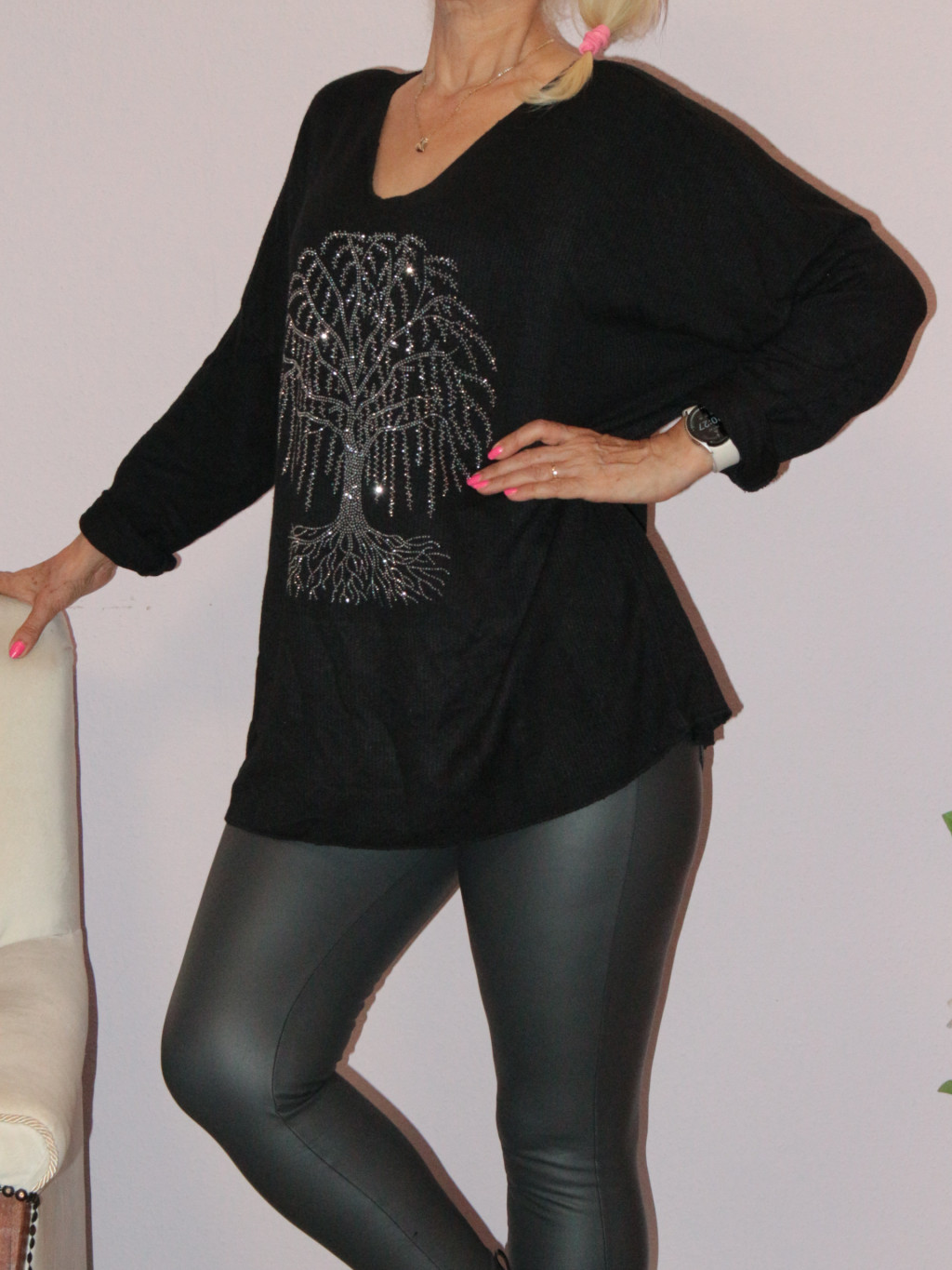 Strasszos életfás,denevérujjas felső ! fekete XL-XXL