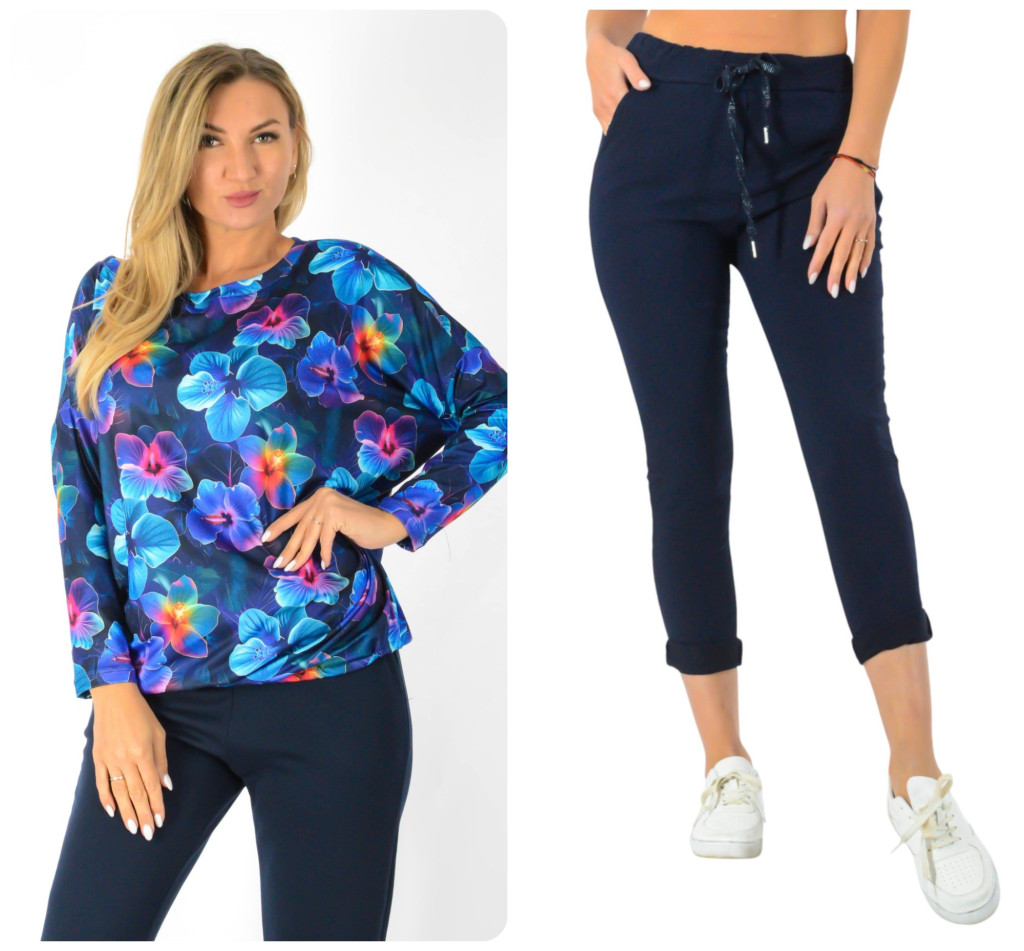 Virág mintás aszimmetrikus gumis aljú ,nadrágos szett !  L-XXL